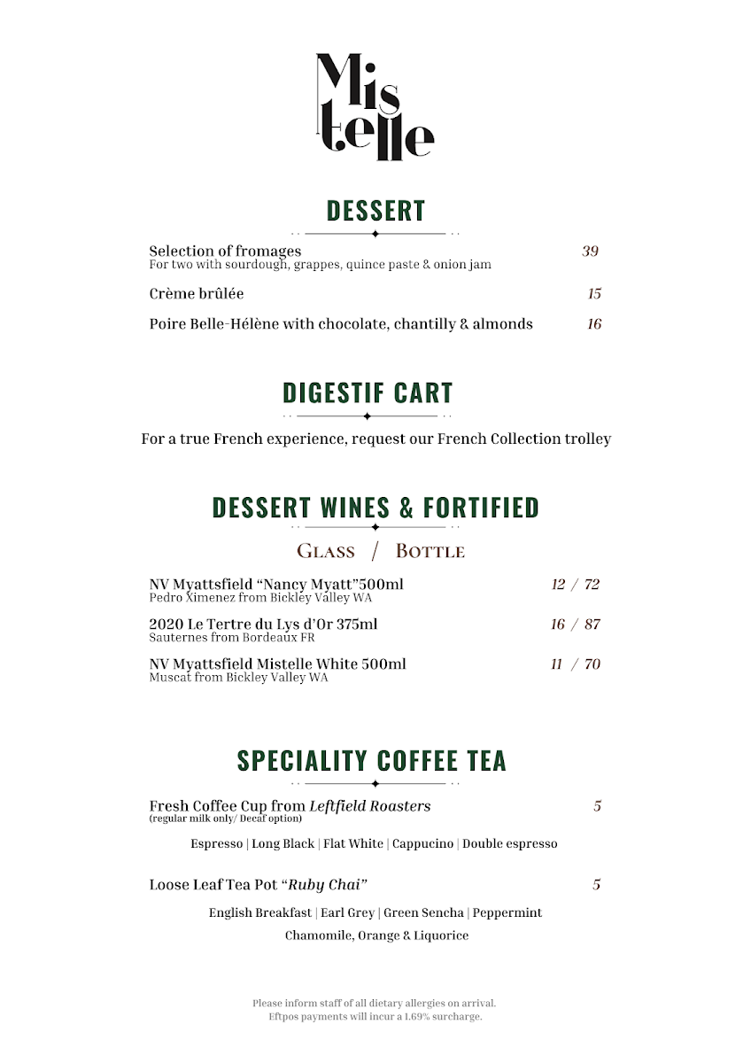 Complete your meal with a sweet finish, such as the iconic Crème Brûlée or a seasonal Caramelised Apple dessert. Mistelle Bistro is more than just a meal, it’s an experience that resonates with passion and culinary artistry.